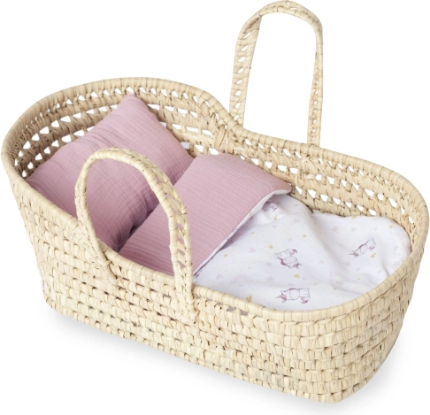 Stílusos és tágas Mózes-kosár babáknak az ANTONIO JUAN márkától, amely élethű gondoskodást kínál a gyerekeknek szeretett babájukról. A kosár kézzel szőtt, szárított pálmalevelekből készült, ezért környezetbarát és 100% természetes anyagokból áll. A csomag része a ágynemű párnával és matraccal, így minden játék kényelmes és fantáziadús lesz. 42–50 cm méretű babákhoz alkalmas.