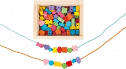Legyenek akár csillagok, szívecskék vagy virágok, ez a fából készült doboz tele fűzhető fa gyöngyökkel mindenkit elbűvöl. A kreativitásnak nincs határa, így a gyerekek tetszés szerint készíthetnek karkötőt vagy nyakláncot. A gyöngyök zsinórra fűzése fejleszti a szem-kéz koordinációt és a finommotorikát. Milyen ékszert készítesz először? Főbb jellemzők: 81 színes gyöngy, 2 fűzőzsinór