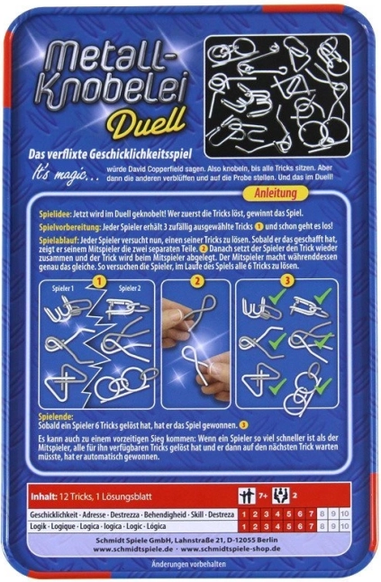 A SCHMIDT Metall-Knobelei Duell készlet tizenkét, okosan megtervezett fém ördöglakatot kínál praktikus fémdobozban. Mindegyik darab próbára teszi a türelmet, a logikát és a finommotorikát: először a két részt erő nélkül válassza szét, majd illessze vissza az eredeti alakba. A mellékelt illusztrált útmutató bármikor segítséget adhat.