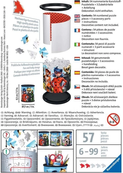 Fedezd fel a Ravensburger 3D puzzle varázsát, amely könnyen összerakható a speciális, ívelt daraboknak köszönhetően. Ezek garantálják a stabil szerkezetet ragasztó nélkül. Összerakás után az állvány nem csak ceruzatartóként, hanem kozmetikumok vagy más apróságok tárolóhelyeként is szolgálhat a gyerekszobában.