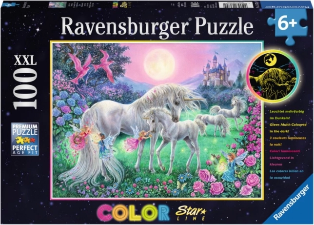 A RAVENSBURGER szórakoztató és varázslatos világító puzzle telihold alatti egyszarvú motívummal a kisebb és nagyobb kirakózók számára egyaránt elbűvölő. A speciális fluoreszkáló nyomat fényre töltődik, és világít a sötétben. A 100 XXL darabnak köszönhetően a 6 éves kortól ajánlott kirakó könnyen összeállítható, fejleszti a türelmet és a finommotorikát. Az összeállított kép mérete kb. 49 × 36 cm.